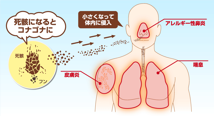 - ダニが活発になり、死骸やフンが空気中に舞いやすくなる